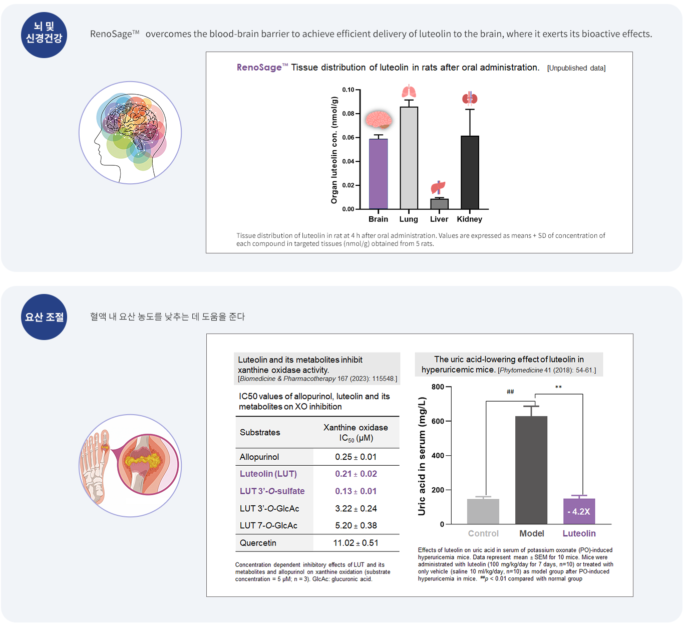 원료 - 건강식품 건강식품 RenoSage™ 구분 국화추출물 Origin 국화 원산지(제조사) 대만 (Vitech Co., Ltd) 다수의 수상 결과와 다양한 국가의 특허 보유 상세정보 발효 콩 추출물 Renosorb 기술을 적용해 수용성을 84,000배 높이고, 생체이용률을 8.5배 향상시킨 아피제닌 성분·함량 RenoSage™ / 덱스트린 효능·효과 뇌 및 신경 건강 요산 조절 Features 다수의 수상 결과와 다양한 국가의 특허 보유 2026년 SCI 논문 발행 List Next RenoFlavone™