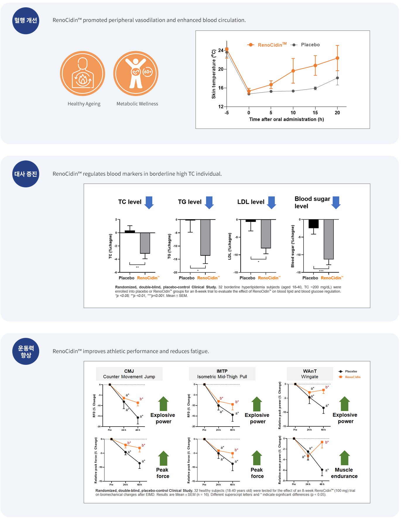 원료 - 건강식품 건강식품 RenoCidin™ 구분 발효 시트러스 바이오플라보노이드 Origin 감귤류 과일류 원산지(제조사) 대만 (Vitech Co., Ltd) GLP safety studies US FDA New Dietary Ingredient 상세정보 발효 시트러스 바이오플라보노이드 Renosorb 기술을 적용해 수용성을 10,000배 높이고, 구강 생체이용률을 6배 향상시킨 헤스페리딘 성분·함량 RenoCidin™ / 덱스트린 효능·효과 운동 효과 향상 심장 건강 Features 다수의 수상 결과와 다양한 국가의 특허 보유 2026년 SCI 논문 발행 미국 NDI(New Dietary Ingredient) 등록 (등록 번호: 1253) List Prev RenoFlavone™ Next 팔밋올레산 함유 명태(알레스카폴락)유래<br>정제어유(제2024-18호)